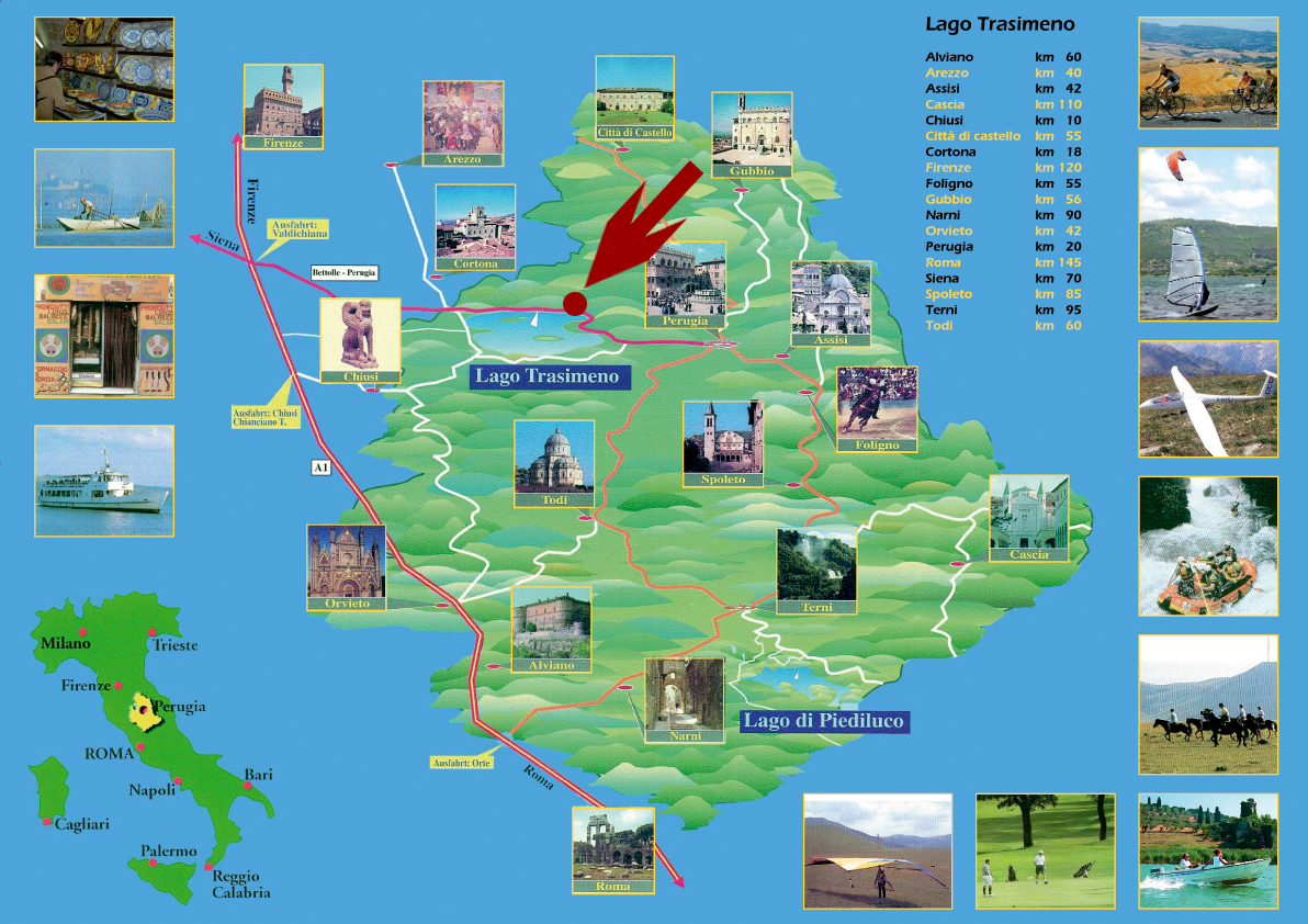 Der Lago Trasimeno liegt mitten im sogenannten grünen Herzen Italiens. Von hier aus erreicht man mühelos Städte wie Siena, Assisi, Perugia oder Florenz, um nur einige zu nennen.